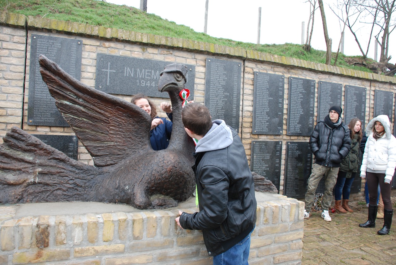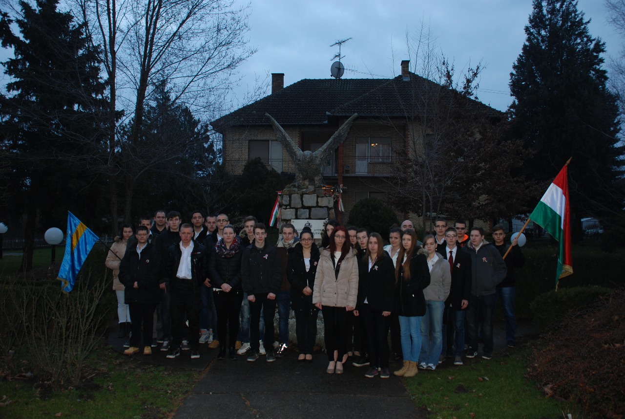 Utunk első állomásaként a határt átlépve Szabadkán megálltunk a zentai úti temetőnél, ahol a partizánok által végrehajtott 1944-es vérengzések áldozataiért épült emlékhelyhez mentünk. A parcellát – amely a tömegsírok helyén épült - szögesdrótos kerítés vesz körül, mivel 2013-ban ellopták a Vergődő madár szobrot. Érkezésünkkor meg is szólalt a riasztó, és kitartóan vijjogott, de ez nem akadályozott meg minket abban, hogy Fazekas Szandra szavalását követően megkoszorúzzuk az alkotást. Délután Magyarkanizsán megtekintettük a Tondach cserépgyárat, a tangazdaságot, és a fogadó középiskolát. Itt az igazgató fogadott minket, aki beszámolt merésznek tűnő, a magyarság érdekeit védő terveiről. Este értünk Tóthfaluba a szállásra, ahol az ellátás, a felszolgált ételek minősége és mennyisége kiváló volt.